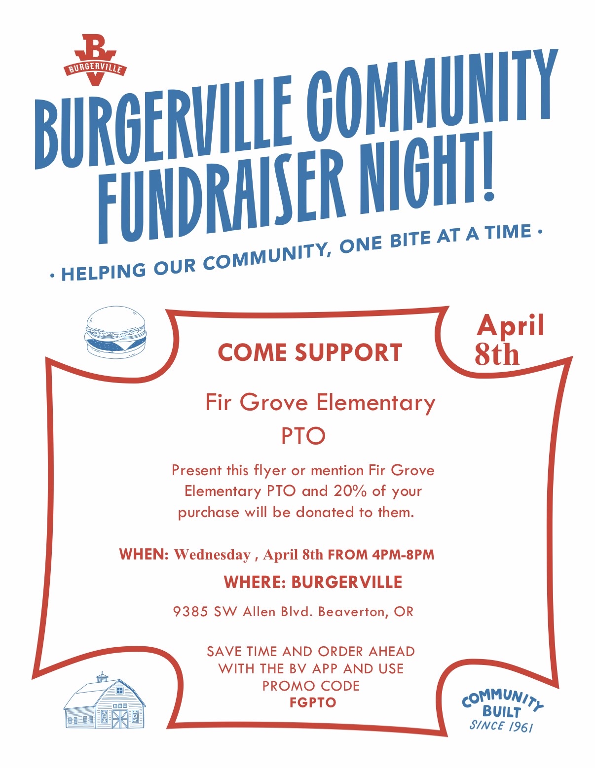 Be sure to mention Fir Grove PTO when you order! You can also use the promo code FGPTO on the Burgerville App at check out when ordering at the Allen & Scholls location. 20% of these dine-in or app sales will be donated to our school. Thank you for your support!